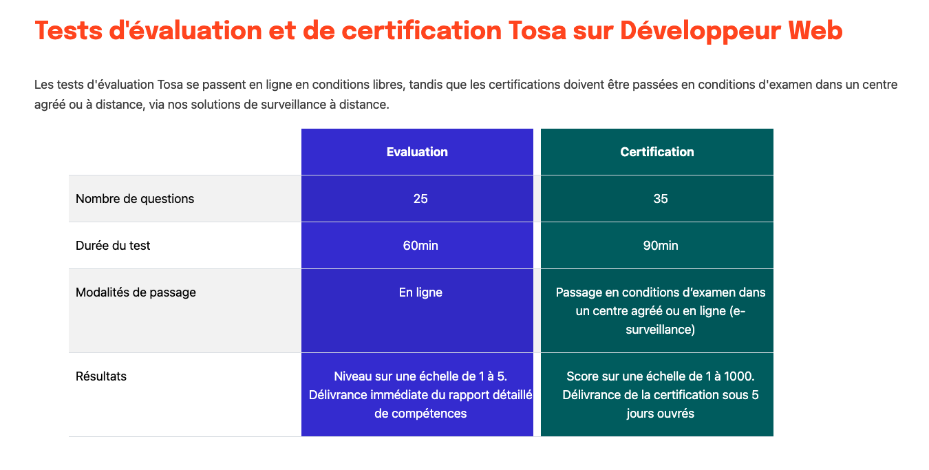 La certification Tosa Développeur Web détermine et valide le niveau de compétence et d'aptitude d'un candidat dans les domaines clés du développement web, tels que HTMLCSS et JavaScript. Elle évalue la maîtrise des principes de base de ces langages, l'utilisation d'éléments avancés, ainsi que la gestion des styles et du Document Object Model (DOM). Cette certification permet aux étudiants, stagiaires, employés ou demandeurs d'emploi de renforcer leur employabilité et d’atteindre leurs objectifs professionnels dans le domaine du développement web.